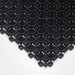 Покрытие состоит из отдельных модулей, собираемых в ковер необходимого размера по принципу пазлов. Бортики модулей прекрасно отсекают влагу, грязь, песок и мелкие камешки, а ячеистая структура и виниловые столбики препятствуют попаданию женских шпилек внутрь покрытия и предотвращают скольжение.